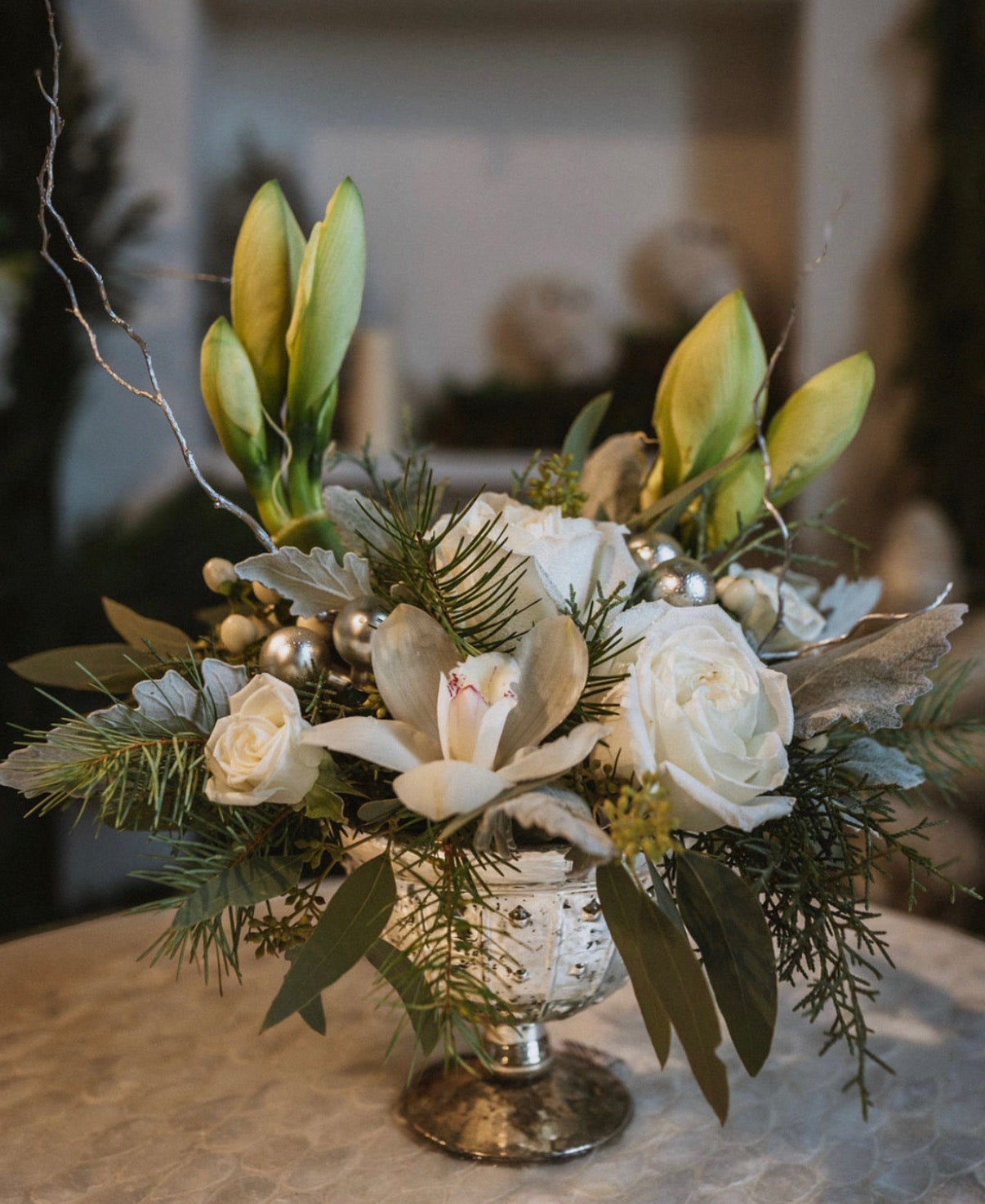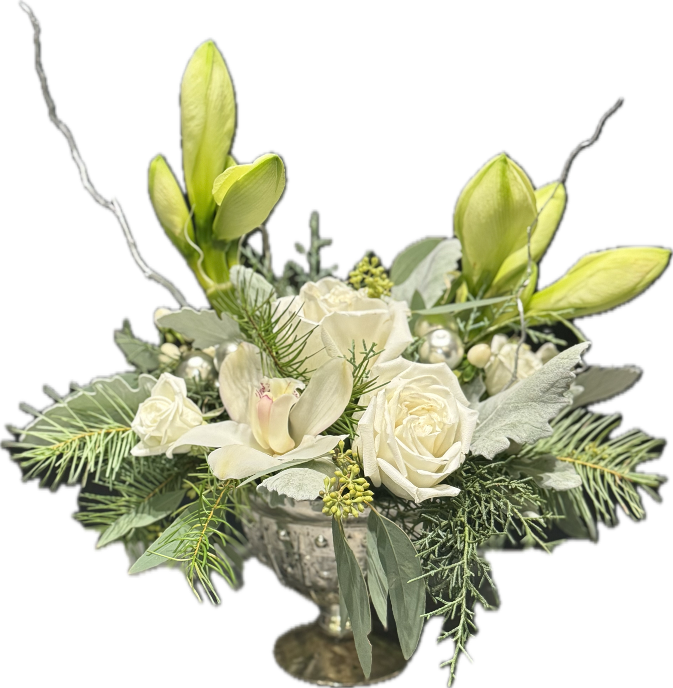 Featuring a modern Christmas design with premium white flowers in an elegant glass pedestal vase. Arranged with white amaryllis, roses and orhid.
